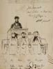 Pen-and-ink sketch, with caption at top, "John Wordsworth, Greek lecturer on Thorpes' [Thomas Thorp's] side, Trinity College -- HSB pinxit". HSB is possibly Henry Stapylton Bree, who died 14 May 1836 at Trinity. Three figures in front of Wordsworth are drawn from the back and identified by surname: Howes, Maurice, Maitland [Thomas Chubb Howes, possibly Mowbray Morris and John Gorham Maitland]. With three more lines of names below: Bree, Bowes, Byles, Macgregor, Ritchie, Sugden, Busk, ? , Neat, Waldegrave, Joy, Adcock, and Grant. These students were all admitted in 1834 and 1835 and are possibly Bree himself, Edmund Elford Bowes, James Byles, Walter Grant James Macgrigor, William Ritchie, Frank Sugden, Hans Busk, Richard Henry Neate, William Frederick Waldegrave, William Joy, Halford Henry Adcock, and Alexander Grant.